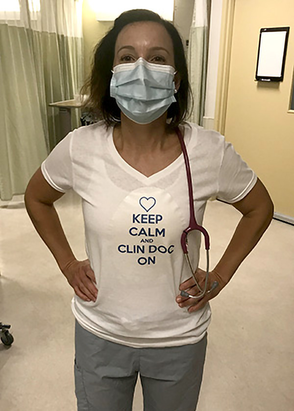 埃利奥特(Elliott)周一到达工作,准备好了Go Live,并在T恤上戴着她的支持,上面写着“保持冷静和临床医生”。