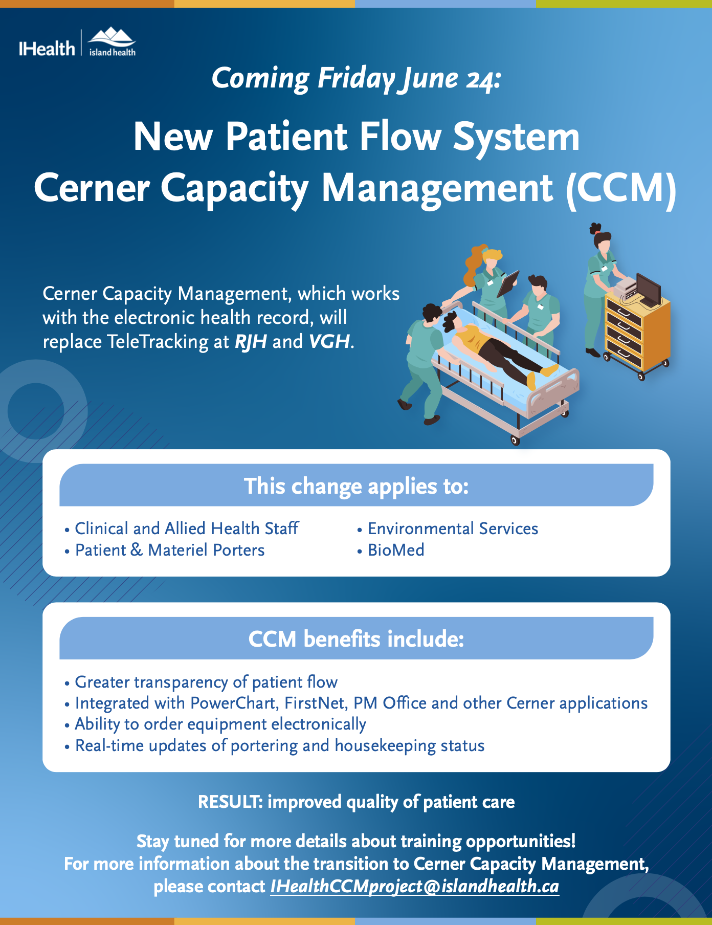 OnFriday June 24, Cerner Capacity Management, which works with the electronic health record, will replace Teletracking at RJH and VGH.