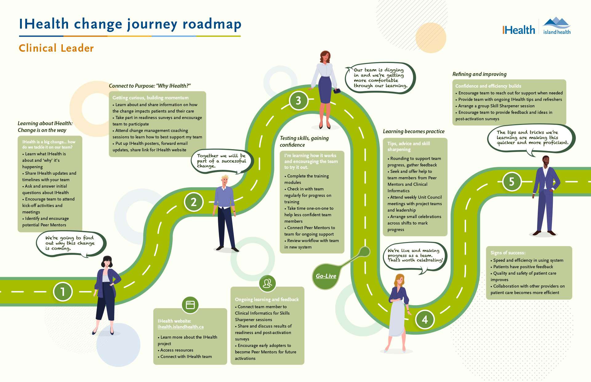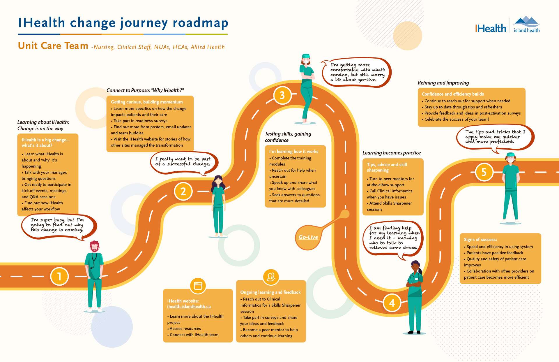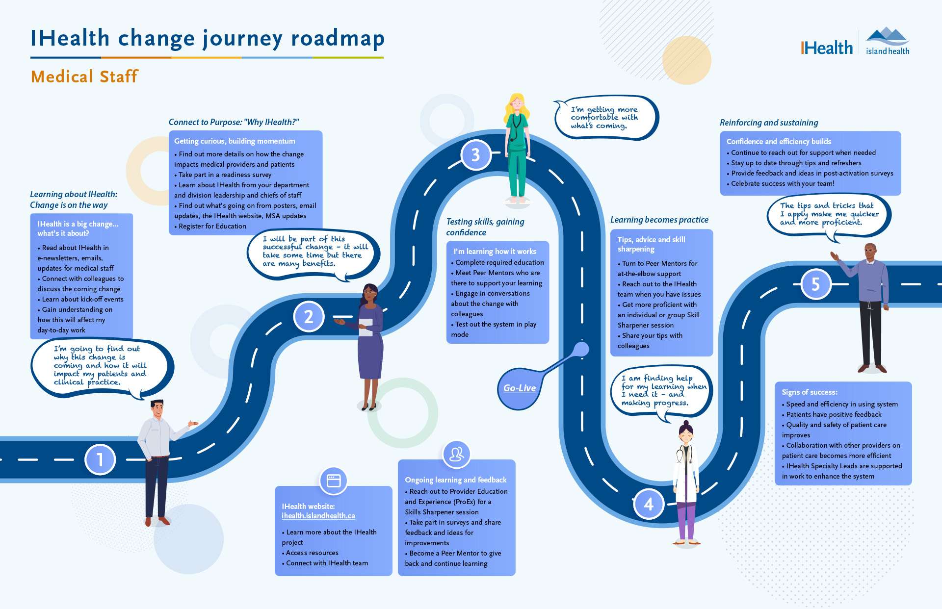An infographic summary of the IHealth vision, changes to medical and clinical practice that health care providers and workers will experience, and benefits of implementing IHealth, for staff and patients.